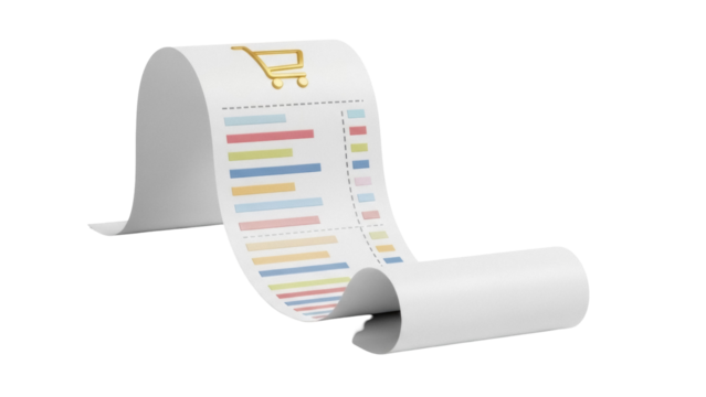 Long receipt paper roll with shopping cart icon isolated PNG, financial report for business and accounting concept