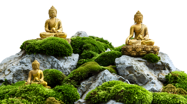 golden buddha statues on mossy rocks on transparent background, detailed photo, png