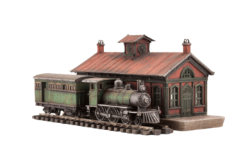 Historic steam train exhibition railway museum digital indoor environment wide angle engineering marvels. Set PNG