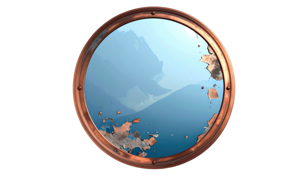 Round mirror reveals serene mountains behind a rusty, copper frame