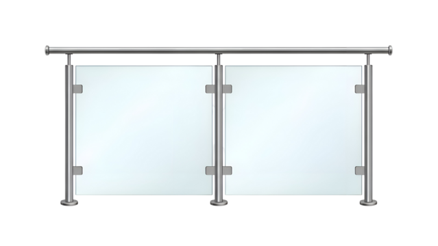 Modern glass balustrade with stainless steel posts isolated on transparent background