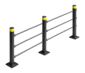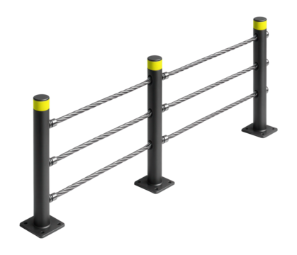 A metallic, stylized three-railed fence, with rounded posts and horizontal bars, against a black backdrop