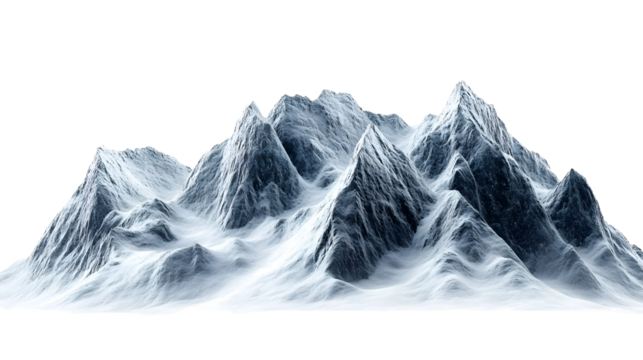 Jagged snow covered mountain peaks with deep valleys and black background winter, Isolated On Transparent Background, Png Cut Out