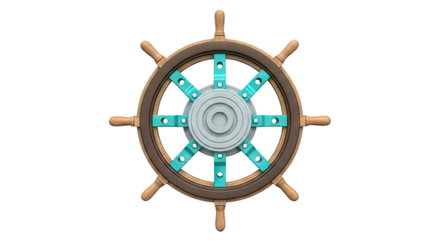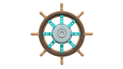 Old nautical helm made of wood and brass, symbolizing control, guidance, success, and journey. Transparent background