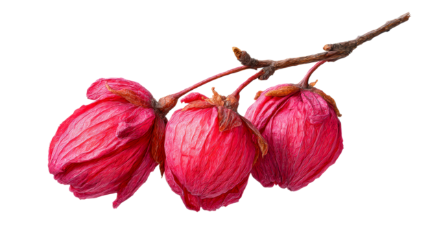Three red fruit pods on a thin stem against a white background, cut out transparent