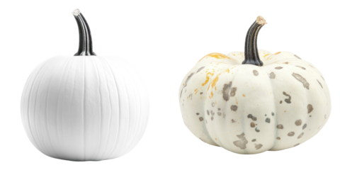 Two white pumpkins with unique textures and stems isolated on white