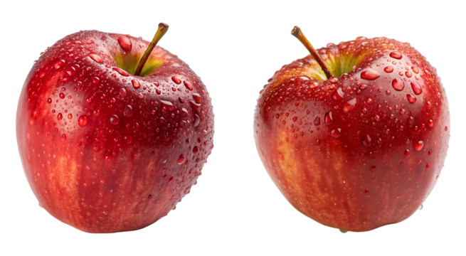 Two fresh red apples with stem and realistic texture isolated