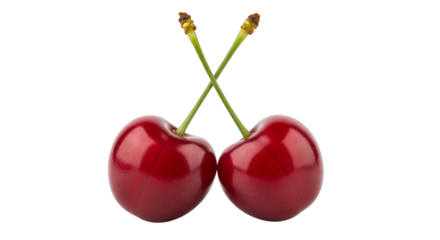 Transparent background vibrant red cherry pair with green stems