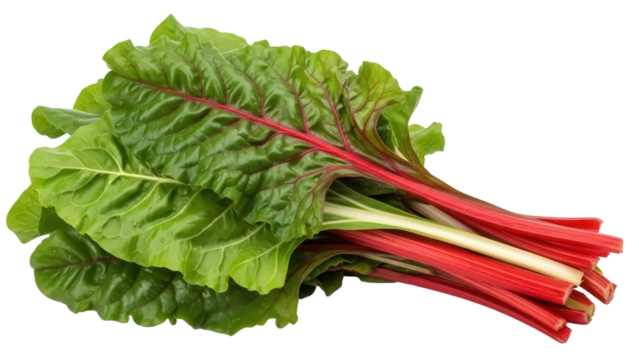 Fresh green Swiss chard leaves with red stems green leaves isolated on a transparent background