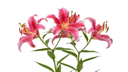 Three pink stargazer lilies isolated PNG on transparent background, beautiful blooming flowers with green stems for floral design