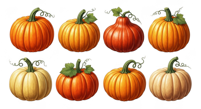 Eight colorful pumpkins with green stems and leaves, illustrated in a playful and festive style isolated on transparent background