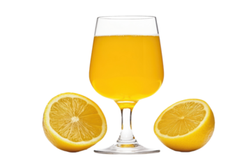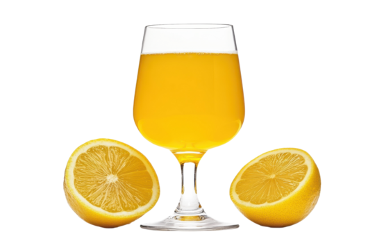 Bright yellow citrus beverage in a stemmed glass flanked by two fresh lemon halves against a on transparent background