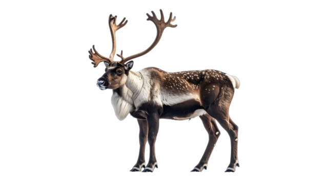 A majestic reindeer with large antlers stands isolated against a stark black background.