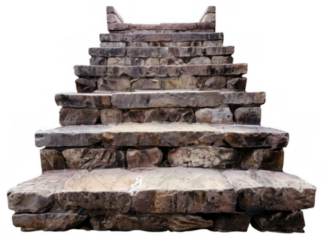 A rustic stone porch with a natural finish and broad steps, ideal for a country home.