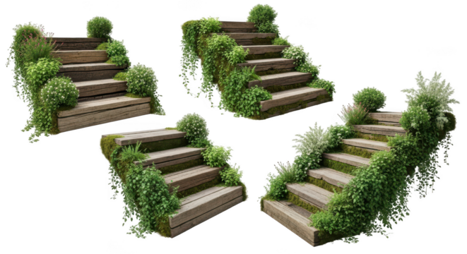 Set of stone steps with green plants png