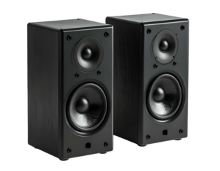 Stack of black audio speakers and subwoofers isolated on transparent background, audio, music, technology.