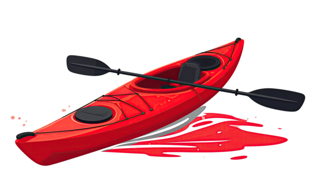 A vibrant red kayak with black paddle, resting atop a red splash, set against a dark backdrop