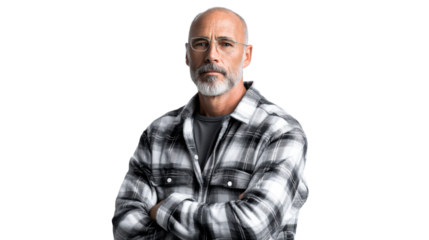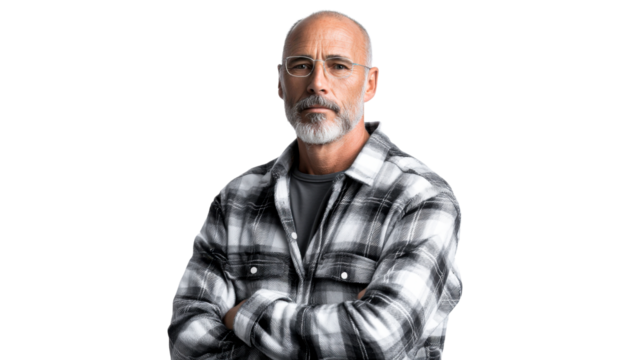 Angry middle aged man with grey hair and black t-shirt, Isolated On Transparent Background