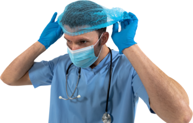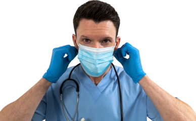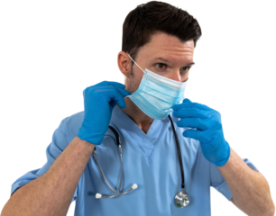 Mid section of man health worker wearing gloves,mask and stetoscop against black backgroud