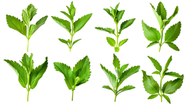 Set of stevia leaves, known for their natural sweetness and use as a sugar substitute in foods and beverages,