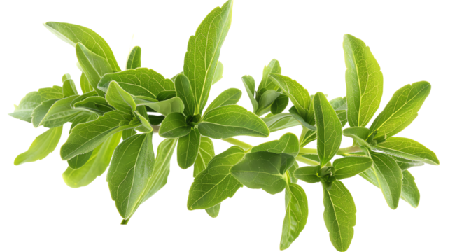 Stevia plant twig featuring pale green sweet leaves, showcasing natural herbal ingredient with clean transparent backdrop, perfect for wellness content