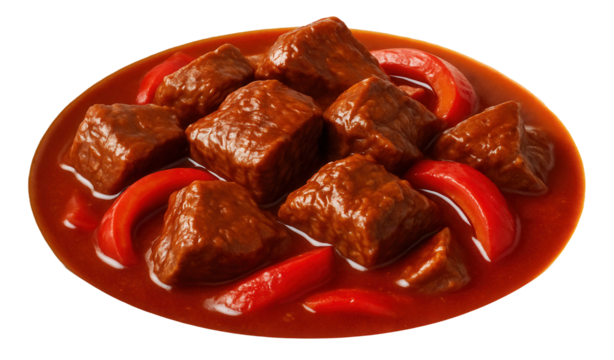 A traditional earthenware pot filled with goulash, with its rustic charm highlighted by the dark, glossy sauce