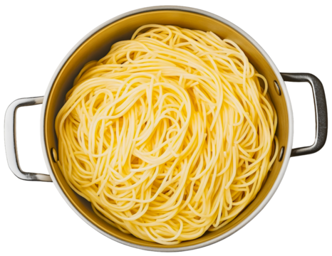 Traditional spaghetti pot from top view isolated with yellow raw Italian preparation. Cuisine lunch overhead creating pasta cooking perfection