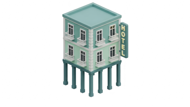 Isometric illustration of a small, vintagestyle hotel building elevated on tall stilts or columns, isolated on transparent background
