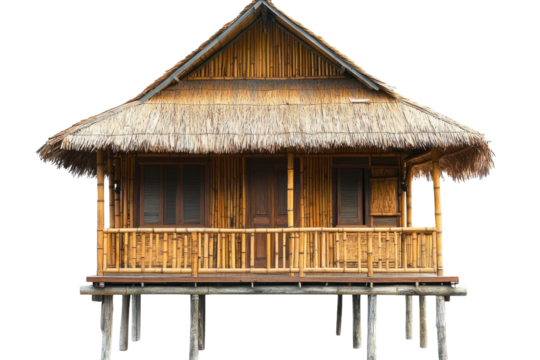 Charming bamboo house elevated on stilts amidst lush greenery during a sunny afternoon isolated on transparent background
