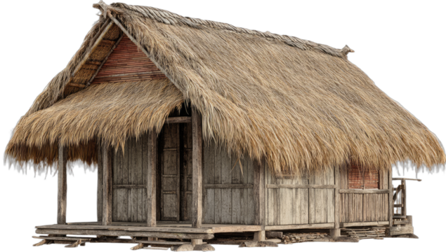 Traditional thatched hut on stilts isolated on transparent background. Wooden hut with a straw roof and ladder isolated on white background.
