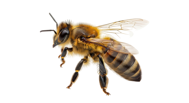 Ai generated image of a detailed macro shot of a honeybee with its wings spread, showcasing its fuzzy body and striped abdomen, isolated on a transparent background