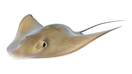 A detailed close-up of a stingray isolated on a white background, showcasing its unique texture and features.
