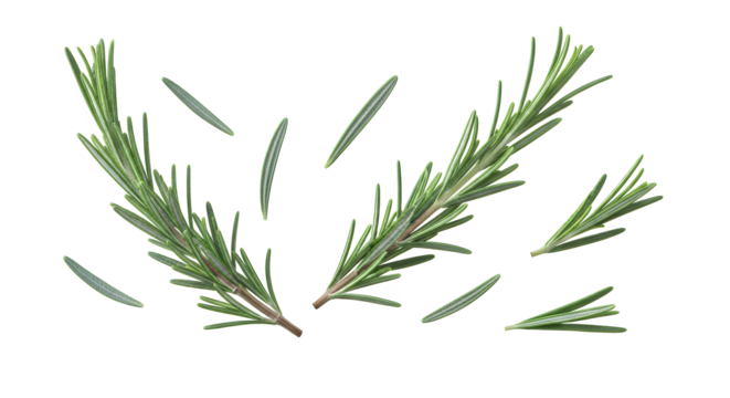 Fresh green rosemary sprigs and individual aromatic leaves artfully scattered on a bright white background, emphasizing their vibrant color and natural texture for culinary use