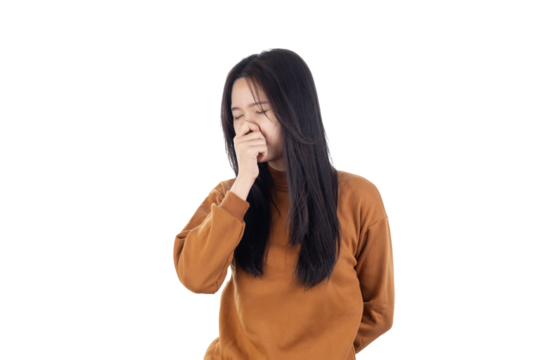 Young Asian woman pinching her nose, reacting to a bad or stinky smell. Concept of unpleasant odor, disgust, and bad aroma. isolated on white background with clipping path.