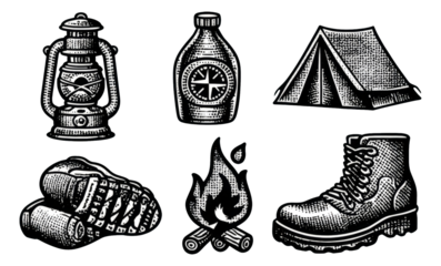 Vintage Camping Gear Illustration with Lantern, Compass, Tent, and Boots Design