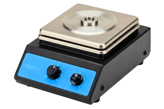 Modern lab magnetic stirrer with unlabelled controls and minimal form, isolated on transparent background.