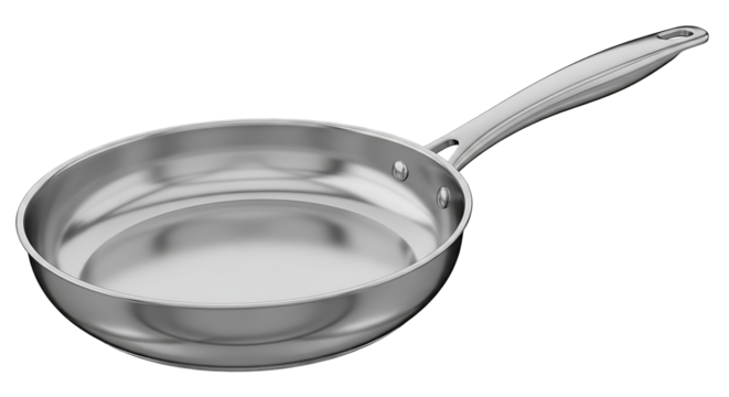 Shiny stainless steel saucepan with long handle isolated on transparent background