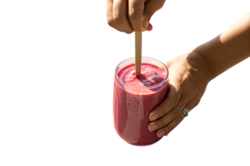 Hands stirring a vibrant pink berry smoothie in a glass with a wooden stick, refreshing healthy drink, isolated on transparent background.