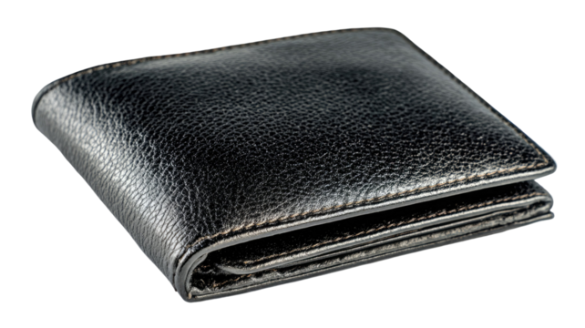 Black leather bifold wallet with pebbled grain texture stitched edges folded profile luxury accessory isolated on white background