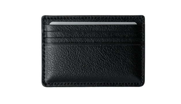 Close-up of a dark gray leather wallet.  Folded, showing supple leather texture and stitching