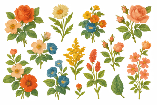 Collection of embroidered floral elements with orange yellow and coral flowers on transparent background, vintage needlework botanical illustration set