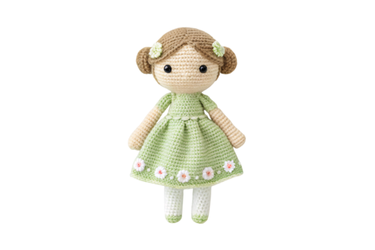 Handmade crocheted doll with brown pigtails wearing mint green dress decorated with small white daisy flowers around hem, isolated on a transparent background