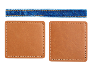Two tan leather patches with stitching detail alongside a blue denim strip.