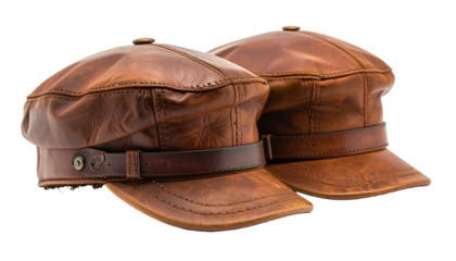 Two weathered, brown leather caps with visors and button details sit side-by-side