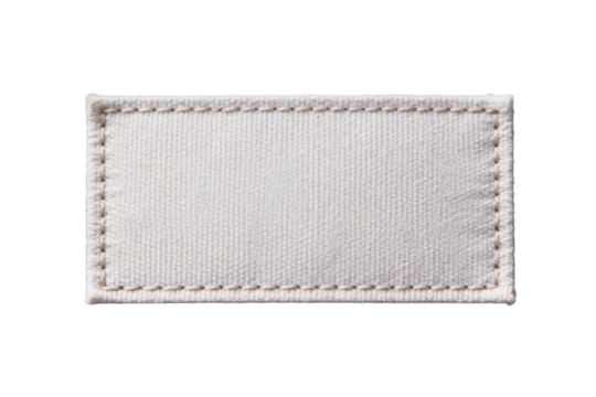 A blank white fabric label with stitched edges, isolated on a transparent background