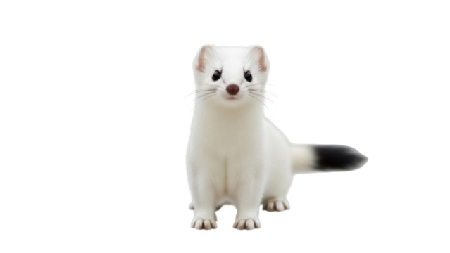 Isolated Ermine in Winter Fur, Stoat Animal, Cute Mustelid Predator Mammal, Black-Tipped Tail