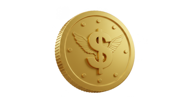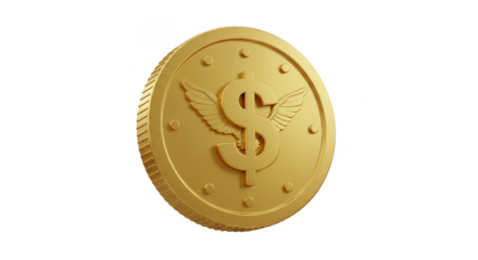A cascade of golden coins falling from above against a transparent background.