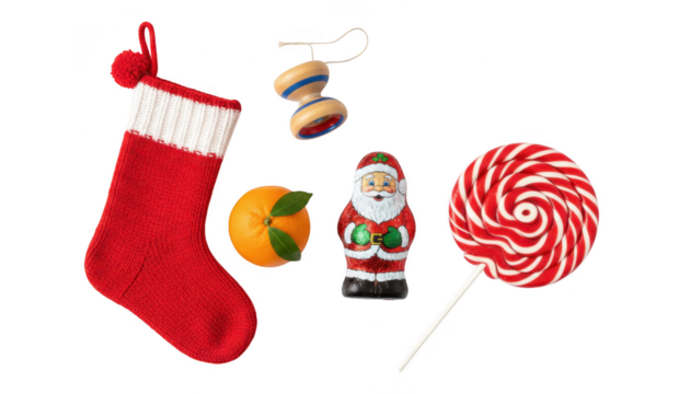 Collection of traditional christmas stocking stuffers including a red sock, candy, toy, and orange isolated on transparent background