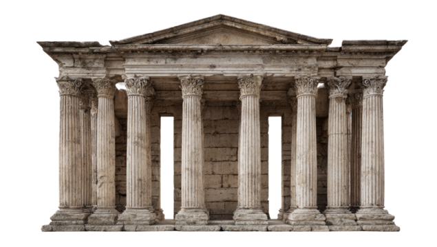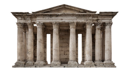 Ancient Roman temple facade with classical columns from a historical building isolated on transparent background