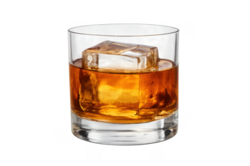 Whiskey bourbon drink with ice cube on rocks transparent background